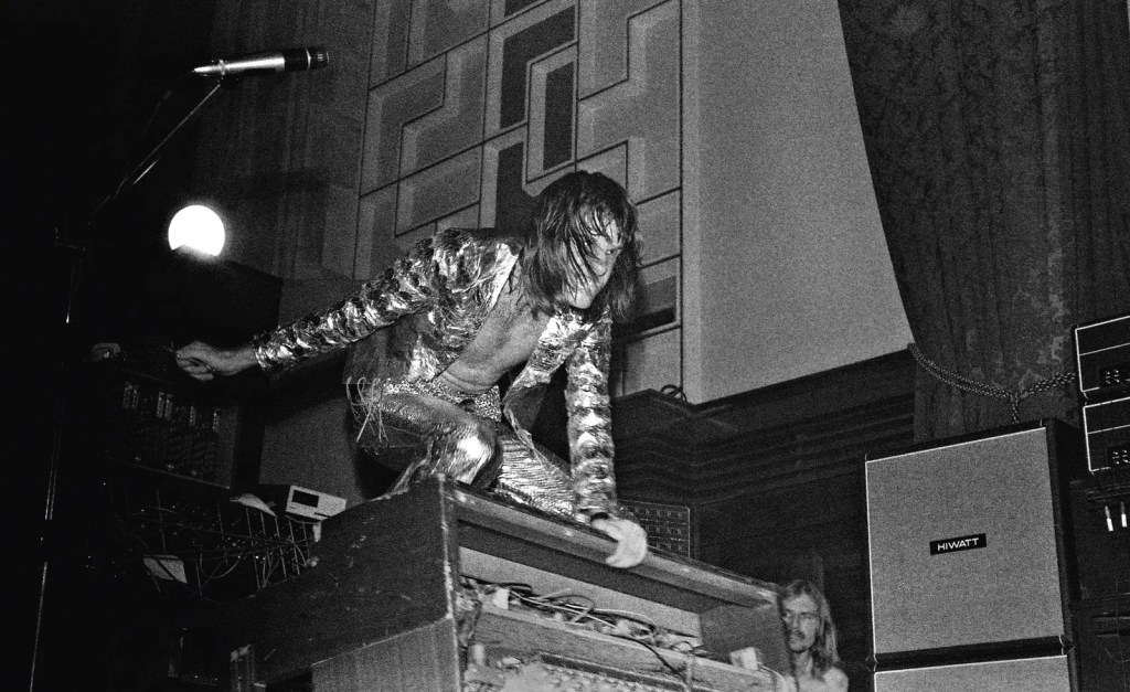 In place of a guitarist, E.L.P. had Keith Emerson, a keyboard virtuoso who liked to wrestle with his customized Hammond organ onstage, and didn’t always win: during one particularly energetic performance, he was pinned beneath the massive instrument, and had to be rescued by roadies. Perhaps this, too, was an allegory…
